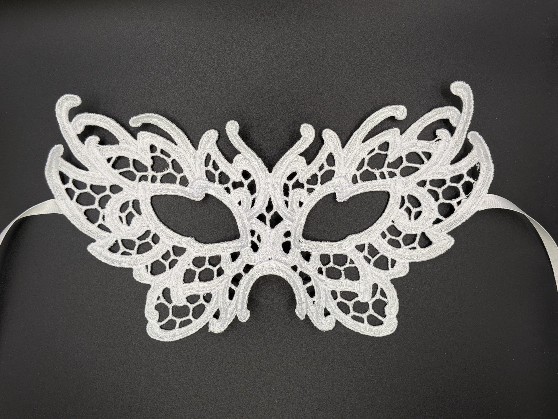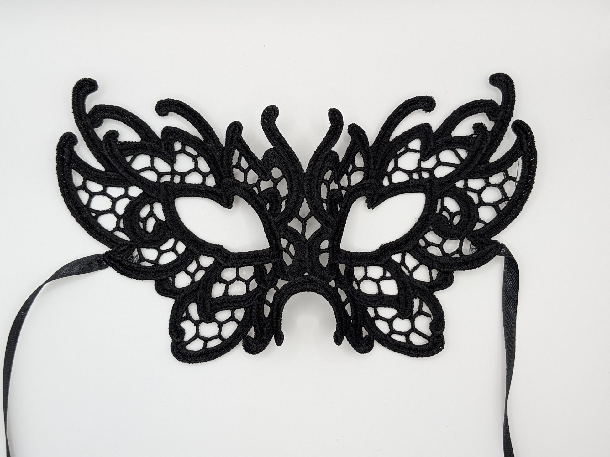 A lace mask, just thread! No plastic or chemicals. Masquerade like it's 1799! Great for masquerades, Carnivale, Mardi Gras, Fat Tuesday, Halloween, just tie it on and go.